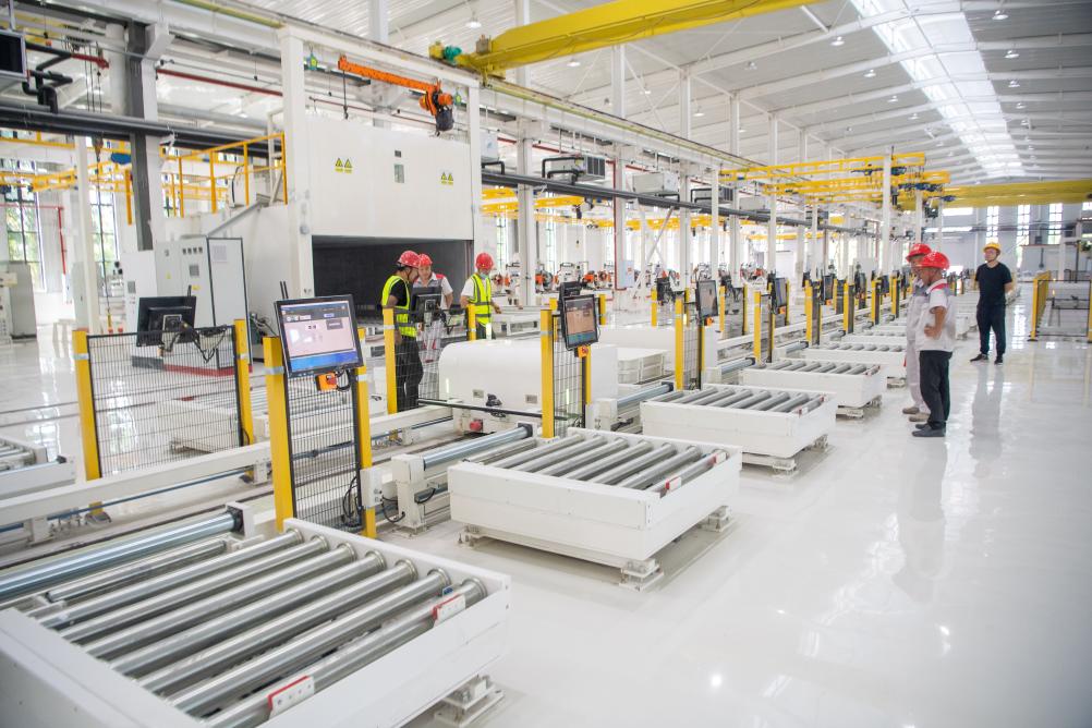 重庆南瑞博瑞变压器有限公司内,工作人员在车间内调试新生产线。近年来,该企业先后成功研制35kV、66kV天然酯绝缘油变压器,以生物降解油替代传统矿物油,进一步向“生态友好”绿色升级。新华社记者唐奕 摄